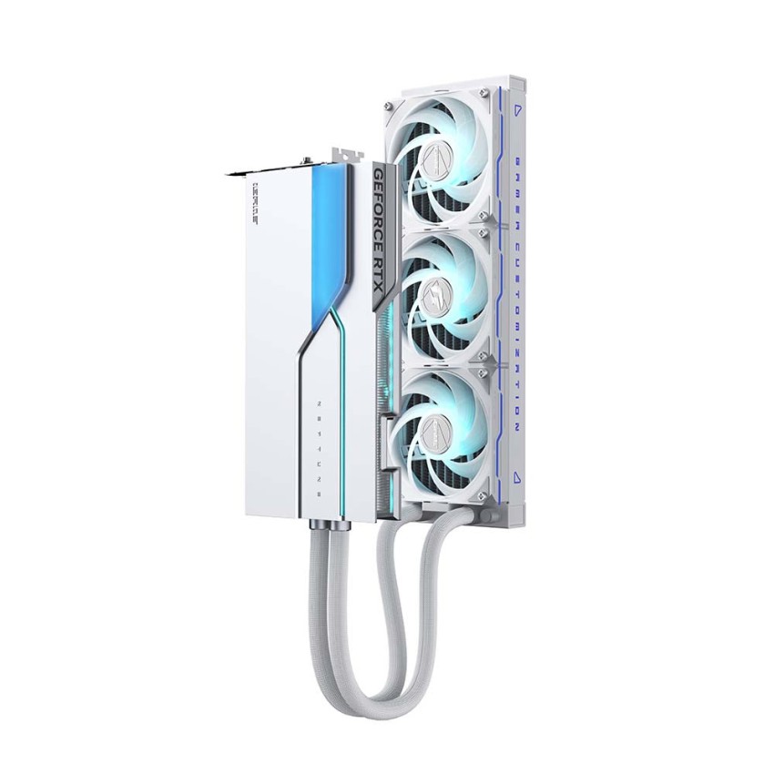 Dòng Neptune của Colorful luôn được biết đến với hệ thống làm mát bằng nước tích hợp sẵn, và RTX 5080 Neptune OC không phải ngoại lệ. Card được trang bị một waterblock nhỏ gọn, chiếm chỉ 2 khe PCIe, kết hợp với radiator 360mm dày 50mm, đảm bảo khả năng tản nhiệt vượt trội. Thiết kế này giữ cho GPU luôn mát mẻ, ngay cả khi hoạt động ở cường độ cao trong thời gian dài, đồng thời giảm thiểu tiếng ồn so với tản nhiệt khí truyền thống. Điểm mới ở phiên bản này là các cổng vào/ra của hệ thống nước được đặt ở phía sau card, tạo vẻ ngoài gọn gàng và thẩm mỹ hơn.