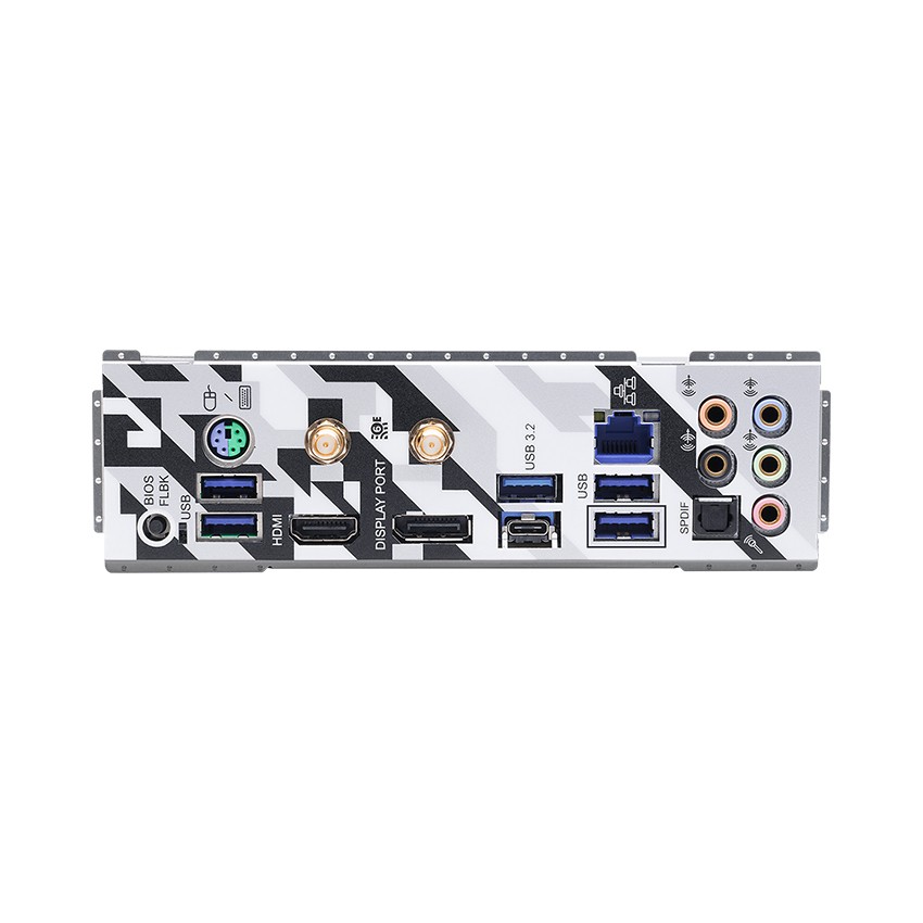 Bảng điều khiển phía sau I/O - 2 cổng ăng ten - 1 cổng chuột/bàn phím PS/2 - 1 cổng HDMI - 1 cổng DisplayPort 1.4 - 1 cổng ra SPDIF quang - 1 cổng USB 3.2 Gen2 Type-A (10 Gb/giây) (ReDriver) (Hỗ trợ bảo vệ ESD) - 1 cổng USB 3.2 Gen2 Type-C (10 Gb/giây) (ReDriver) (Hỗ trợ bảo vệ ESD) - 4 cổng USB 3.2 Gen1 (Hỗ trợ bảo vệ ESD) - 1 cổng LAN RJ-45 có đèn LED (đèn LED ACT/LINK và đèn LED SPEED) - 1 nút BIOS Flashback - Giắc cắm âm thanh HD: Loa sau/Loa giữa/Âm trầm/Đầu vào đường truyền/Loa trước/Micrô (Giắc cắm âm thanh vàng)