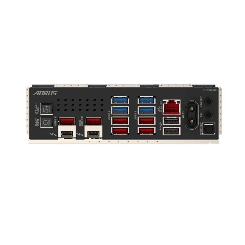 Cổng kết nối (Back Panel) 1 x Q-Flash Plus button 1 x Clear CMOS button 2 x Intel® Thunderbolt™ 4 connectors (USB4® USB Type-C® ports) 6 x USB 3.2 Gen 2 Type-A ports (red) 4 x USB 3.2 Gen 1 ports 2 x USB 2.0/1.1 ports 1 x RJ-45 port 2 x antenna connectors (2T2R) 2 x audio jacks 1 x optical S/PDIF Out connector