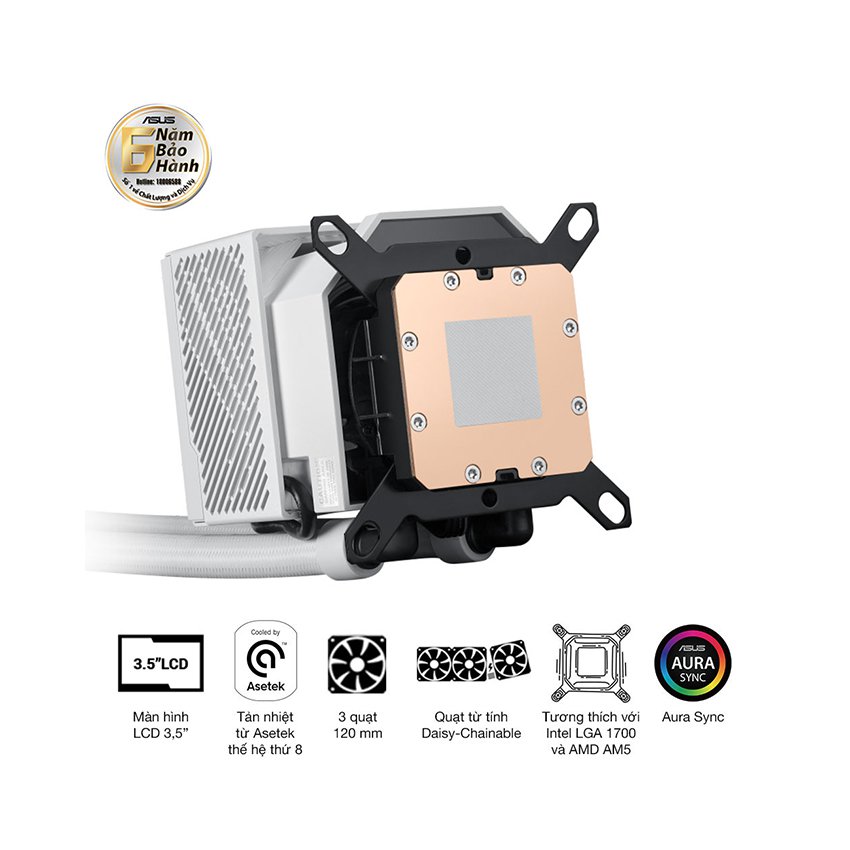 Tính năng nổi bật Dòng sản phẩm làm mát bằng chất lỏng CPU bền bỉ của TUF Gaming LC II ARGB mang lại hiệu năng và các tính năng bạn cần để phát huy tốt nhất các hệ thống chơi game phổ thông. Chất làm mát chảy qua tấm làm lạnh được chiếu sáng đến ống bọc gia cố rồi đến bộ tản nhiệt công suất cao được làm lạnh bằng ba quạt ARGB 120 mm – có cánh có rãnh để mang lại luồng khí tối ưu và giảm tiếng ồn. Trong khi đó, các thành phần Aura Sync ARGB chiếu sáng quạt tản nhiệt và logo TUF Gaming trên nắp máy bơm đảm bảo rằng bạn sẽ có phong cách riêng.