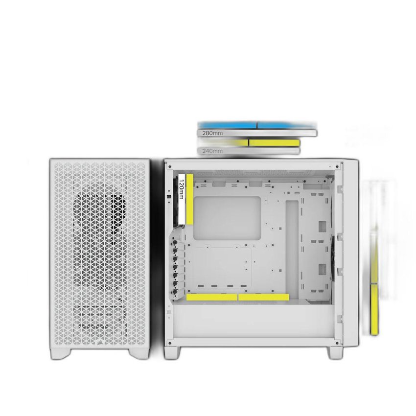 Kích thước của Vỏ máy tính Corsair 3000D Tempered Glass Mid-Tower, White thuộc loại mid tower 466mm x 230mm x 462mm hỗ trợ lắp đặt tối đa tới 8 quạt tản nhiệt case kích cỡ 120mm hoặc 4 quạt 140mm để đảm bảo luồng không khí luôn được lưu thông tối ưu. Vỏ case Corsair này cũng hỗ trợ lắp các bộ tản nhiệt nước với độ dài đa dạng 120mm, 240mm hay 360mm để bạn thoải mái lựa chọn những bộ tản nhiệt hiện đại nhất đáp ứng mọi cấu hình sử dụng.